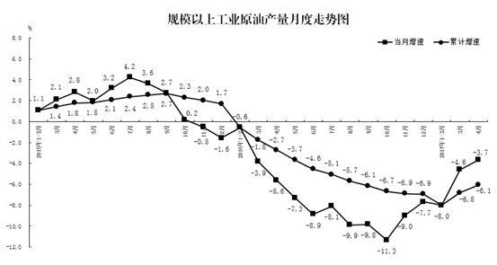 原油生產降幅收窄,進口增長較快。4月份,原油產量1599.0萬噸,同比下降3.7%,降幅比3月份收窄0.9個百分點。1-4月份,原油產量6400.9萬噸,同比下降6.1%。進口13912萬噸,同比增長12.5%。