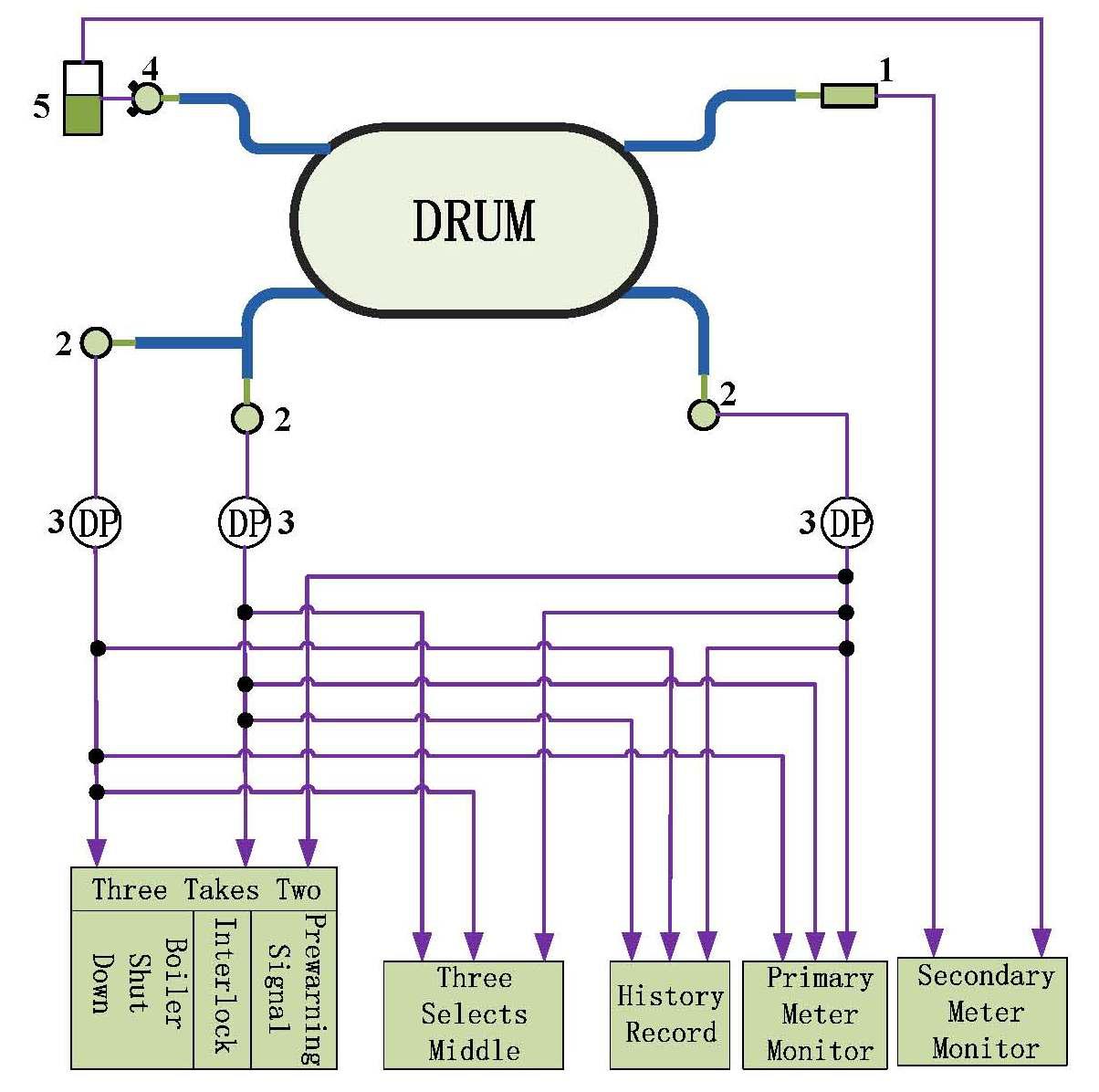(5)保護(hù)系統(tǒng):“三取二”水位停爐、聯(lián)鎖、熱工報警系統(tǒng)信號取自二套電接點(diǎn)水位計(jì)和自動調(diào)節(jié)系統(tǒng)“三選中”開關(guān)量輸出信號。