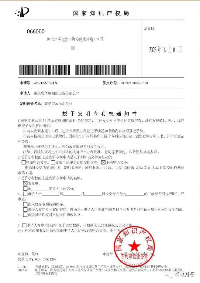 2023年9月1日,秦皇島華電測控設(shè)備有限公司自主研發(fā)的“高精度云母水位計”喜獲國家發(fā)明專利!